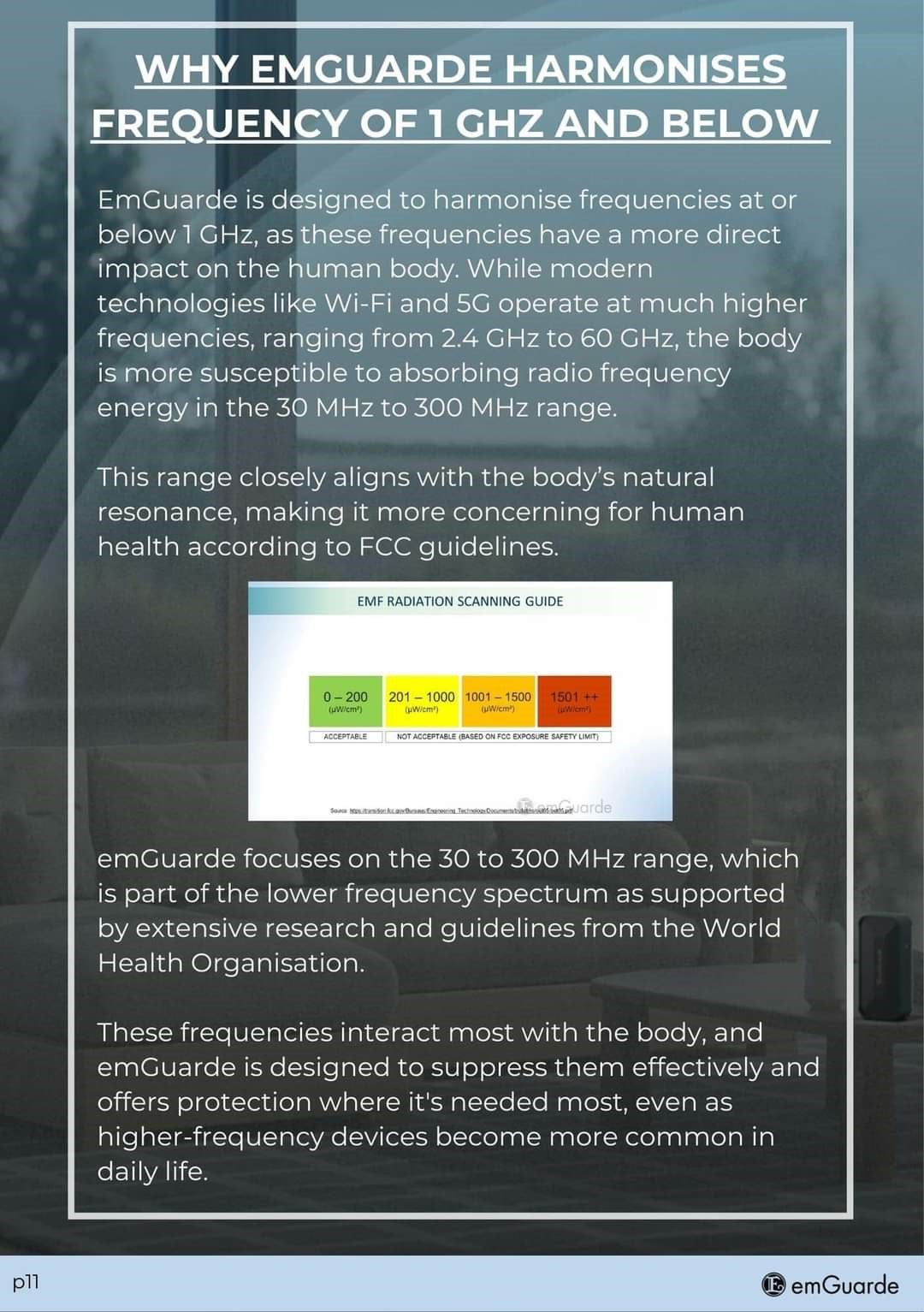 emGuarde utilizes harmonic frequencies to effectively suppress targeted electromagnetic noise radiation between 3MHz to 1000MHz within a 4-meter radius. This harmonizing method achieves a balanced atmosphere while preserving the natural ambient frequencies.